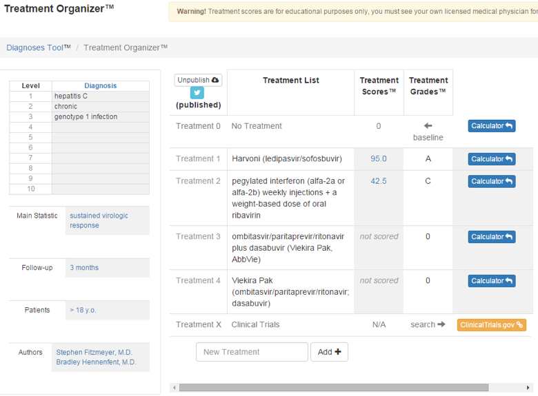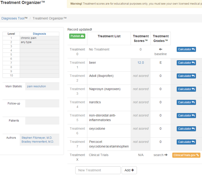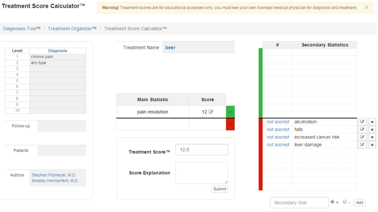 We have created tools to allow you and everyone else in the world to quantify the science of medicine behind medical treatments. These are educational tools only. We call our overall software the Treatment Score Analyzer.