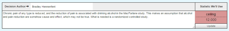 What we have to do is take a look at the statistics we have and come up with the Statistic We'll Use. Once you have created a bunch of STAR Blocks from the best studies you can find, you click the "use" button, which creates a decision box between the studies that you are going to use in your decision and in the studies that you are not going to use.