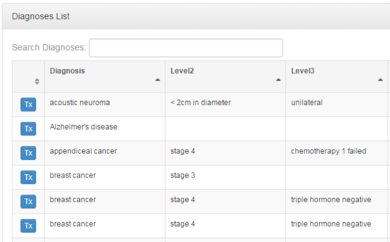 Once you have found or created a diagnosis, you will want to hit the "Tx" icon on the left side of the diagnosis you are interested in.
